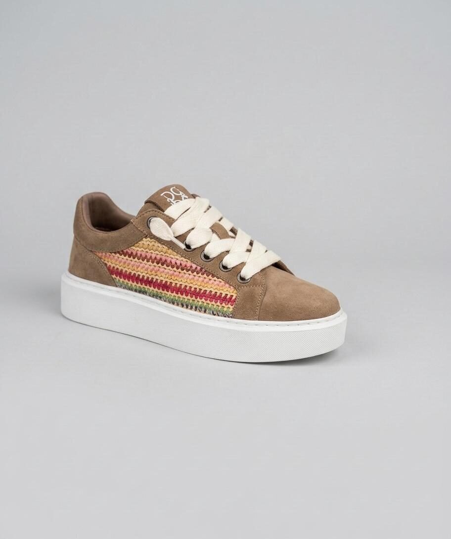 סניקרס זמש בגוון חום-אדמה הכוללות פאנל צד סרוג בעבודת יד בשילוב צבעי קיץ תוססים. השילוב בין המראה הטבעי לסוליית הפלטפורמה הלבנה מעניק טאץ' בוהמי וייחודי לכל אאוטפיט.