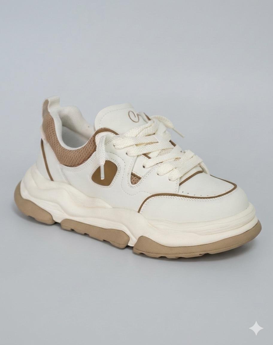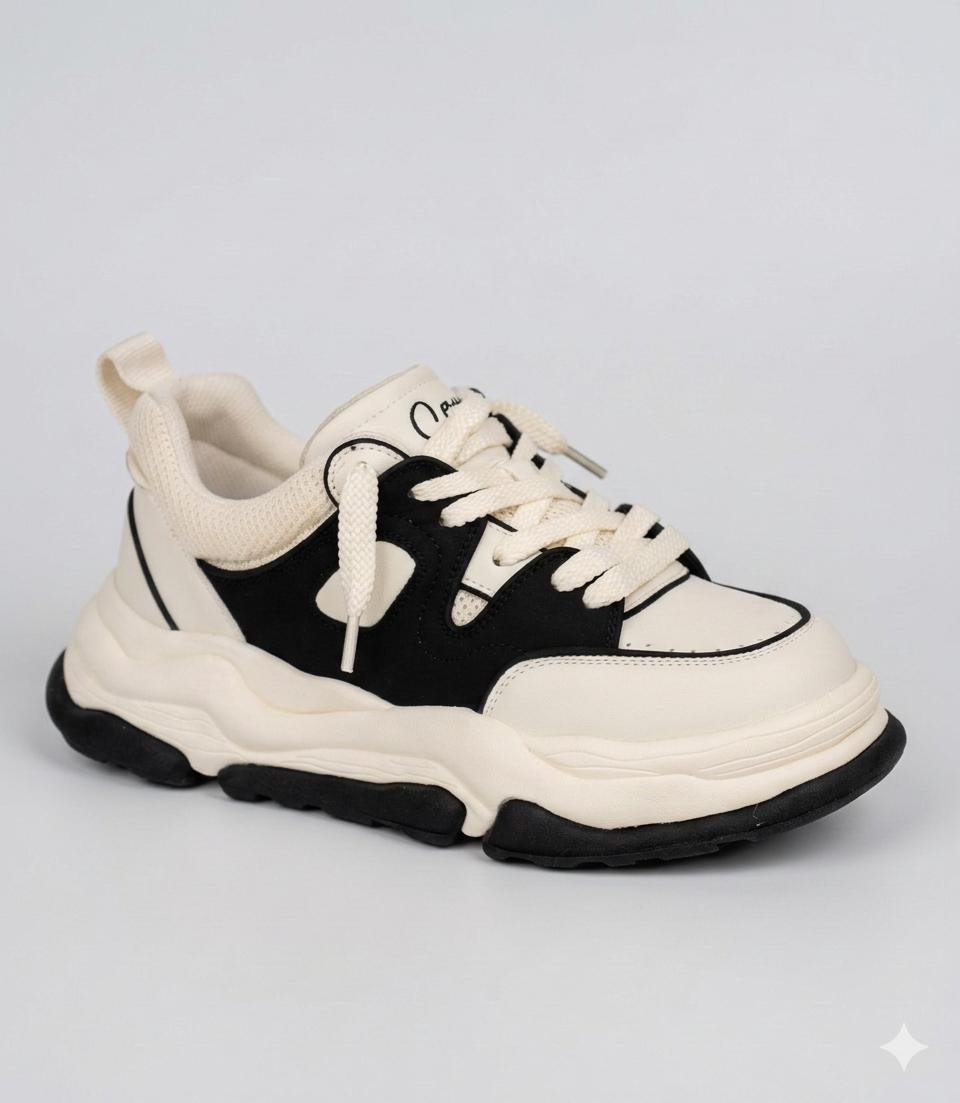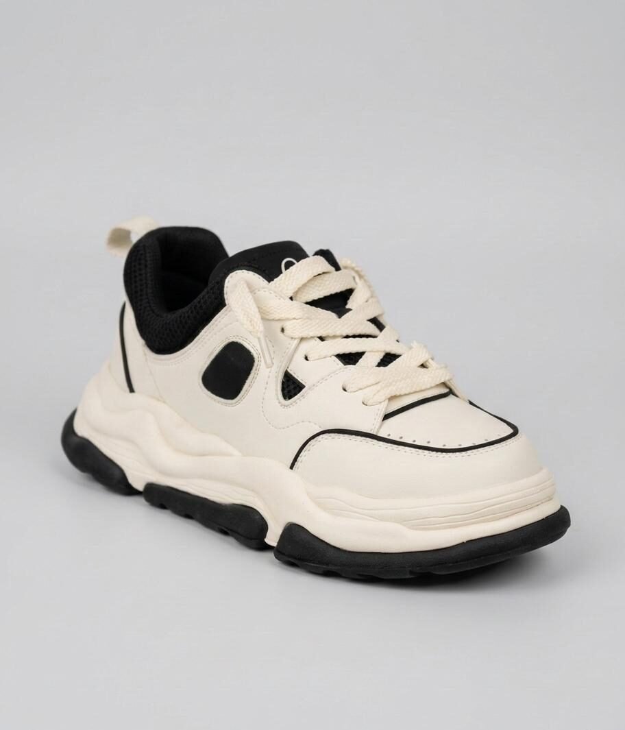 סניקרס בעיצוב עתידני עם סוליית פלטפורמה אסימטרית במבנה גלי ייחודי. הנעל משלבת שכבות של עור סינתטי איכותי וזמש, המעניקים לה מראה יוקרתי ומורכב.