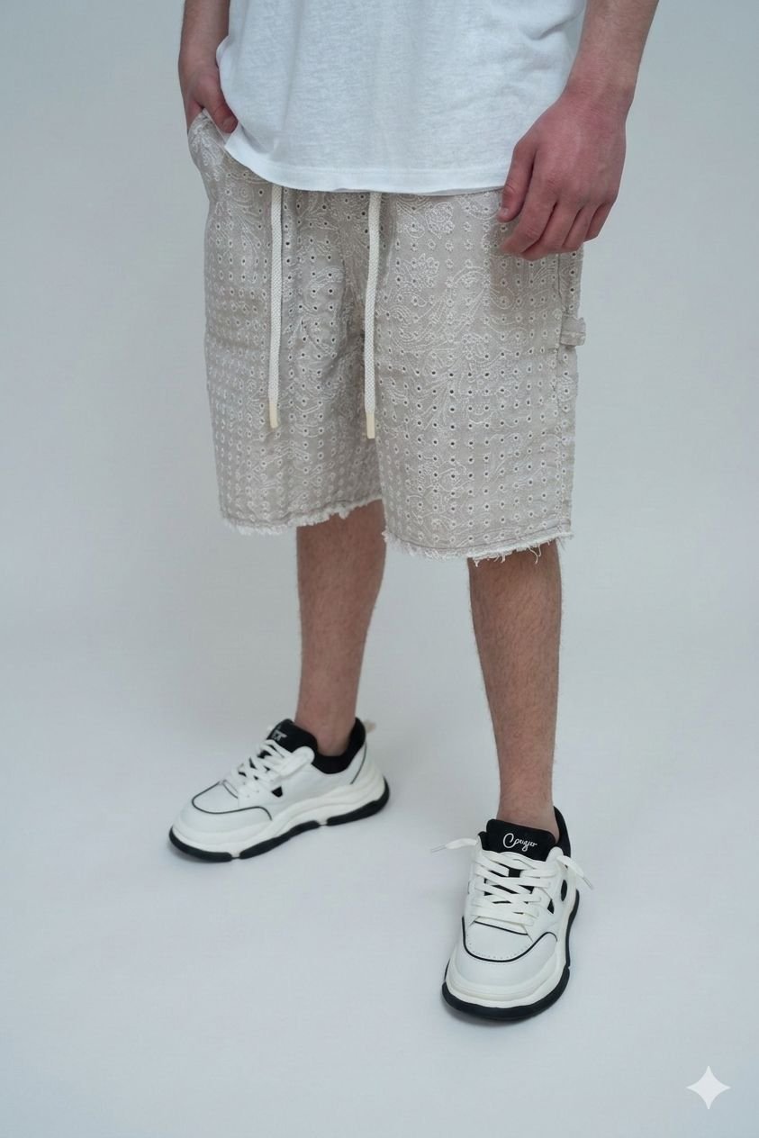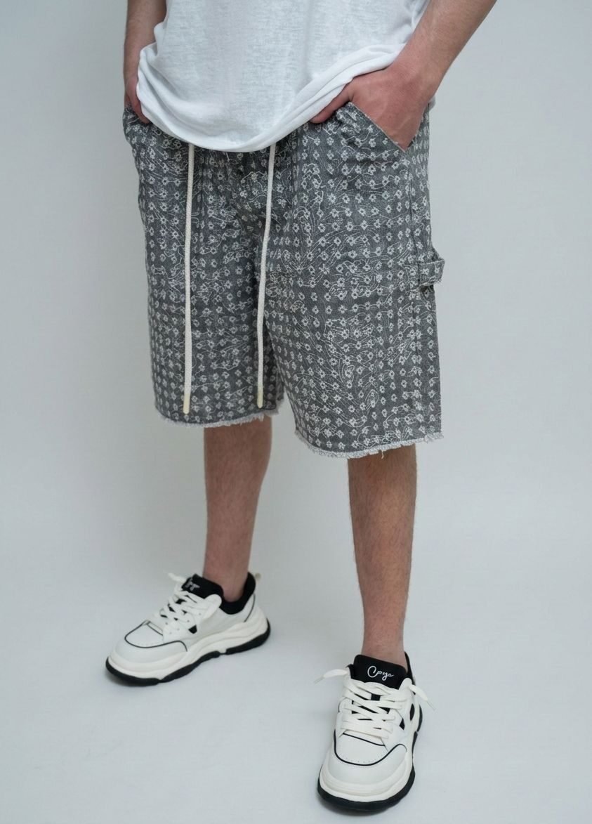 מכנסי שורט עם הדפס פייזלי (בנדנה) בגוון אפור שטוף ומרענן.