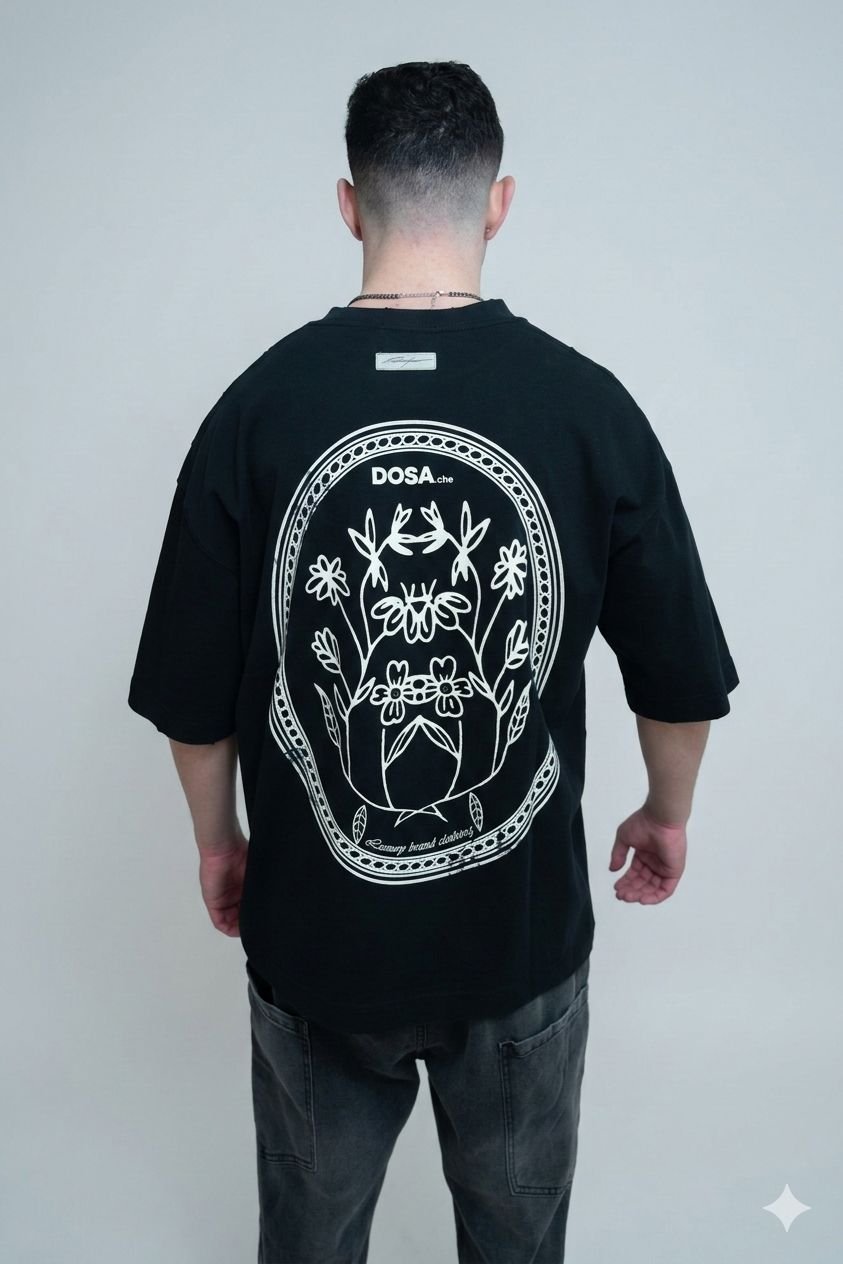 טי-שירט אוברסייז שחורה עם הדפס איור פרחים בתוך מסגרת אובלית על הגב.