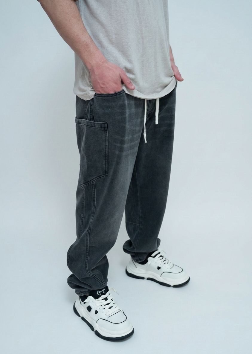 מכנס ג׳ינס אפור בגזרת ג'וגר OVERSIZE עם שרוכים.