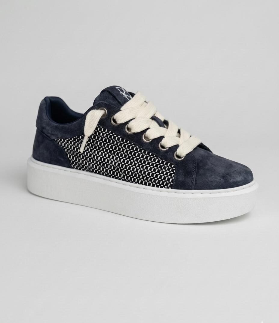 נעל פלטפורמה אלגנטית בגוון כחול עמוק, המשלבת גפת זמש יוקרתית עם פאנל צד בטקסטורת רשת גאומטרית. העיצוב המוקפד והסוליה הלבנה המוגבהת יוצרים לוק מתוחכם ועדכני שמתאים לכל שעה ביום.