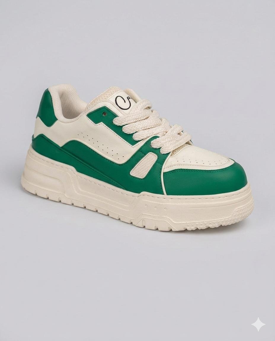 סניקרס פלטפורמה במראה ספורטיבי רענן, המשלבות גווני ירוק דשא ושמנת עם שרוכי חבל (Rope) עבים. עיצוב המעניק נוכחות מאסיבית לצד סטייל רטרו נקי ומדויק.
