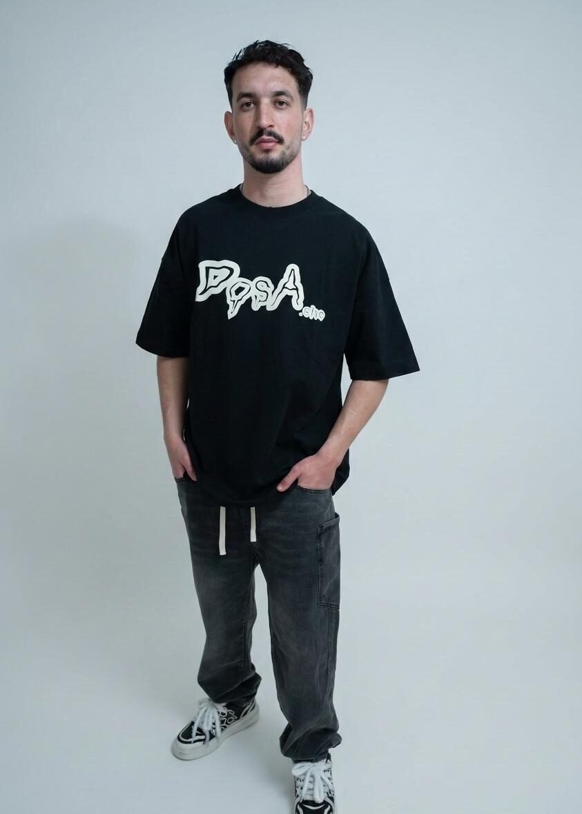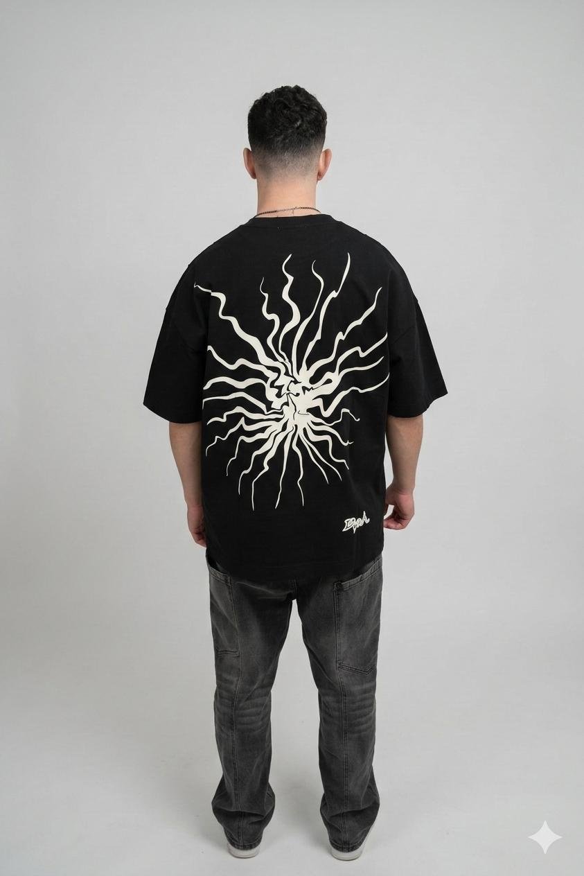 טי-שירט אוברסייז שחורה עם הדפס גרפי של קרני שמש מופשטות על כל הגב.
